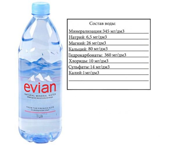 Мінеральна вода Evian містить збалансований склад корисних мікроелементів, таких як кальцій, магній і калій, що сприяють нормальному функціонуванню організму. Вона не містить штучних домішок, має низький вміст натрію, що робить її ідеальним вибором для людей, які дотримуються здорового способу життя.