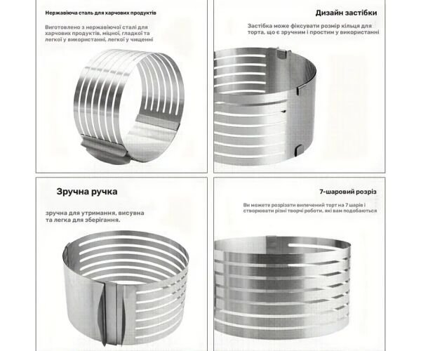 Регульований діаметр — універсальність у використанні Форма має регулювання діаметра від 16 до 30 см, завдяки чому підходить для більшості стандартних бісквітів. Ви можете розсунути або стягнути кільце до потрібного розміру — ідеально для будь-яких форм для випічки. Це зручно як для домашніх тортів, так і для професійних кондитерських виробів.