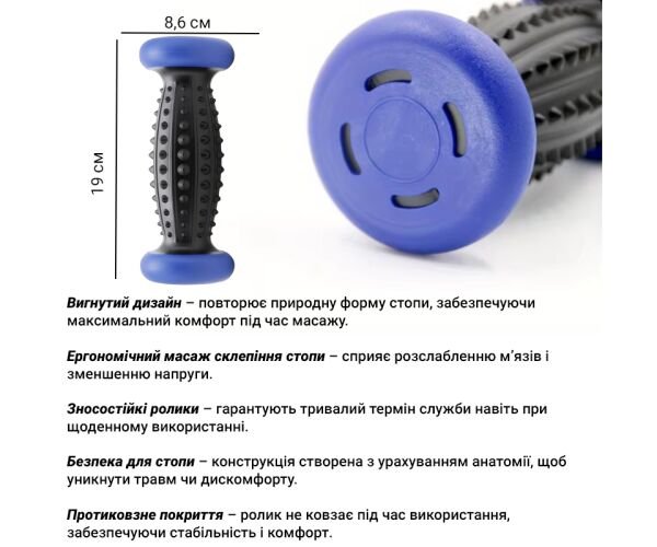 Ролик виготовлений із міцного та зносостійкого матеріалу, що забезпечує довгий термін використання. Його ергономічна форма з вигнутим дизайном повторює природні вигини стопи, забезпечуючи глибокий і комфортний масаж. Спеціальні виступи та ребриста поверхня діють на біологічно активні точки, стимулюючи роботу внутрішніх органів і знімаючи напруження.