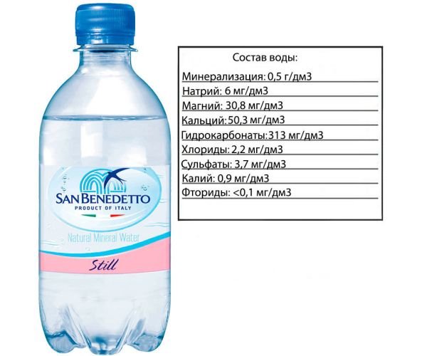 Номінальний об’єм мінеральної негазованої води San Benedetto в міцній скляній пляшці складає 0,33 л.