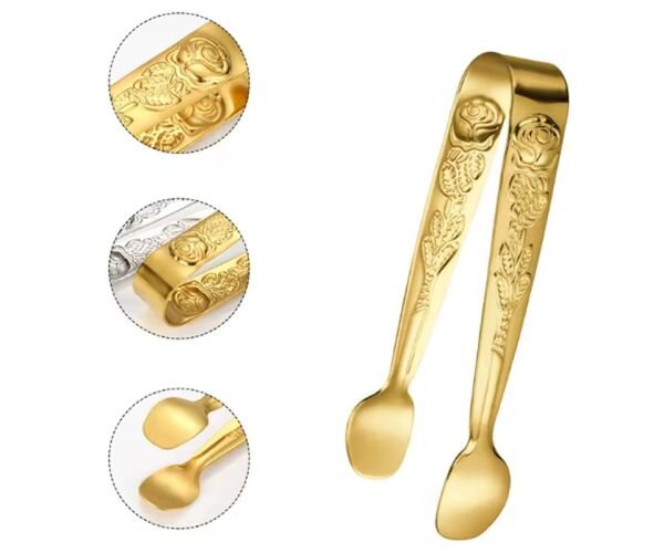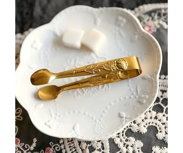 Щипці виготовлені з високоякісної нержавіючої сталі із золотистим покриттям, яке надає їм елегантного вигляду та захищає від корозії. Вишукане гравірування у вигляді квіткового орнаменту робить їх не лише функціональним, але й декоративним елементом. Виріб стійкий до вологи та довговічний, що гарантує тривалий термін служби.