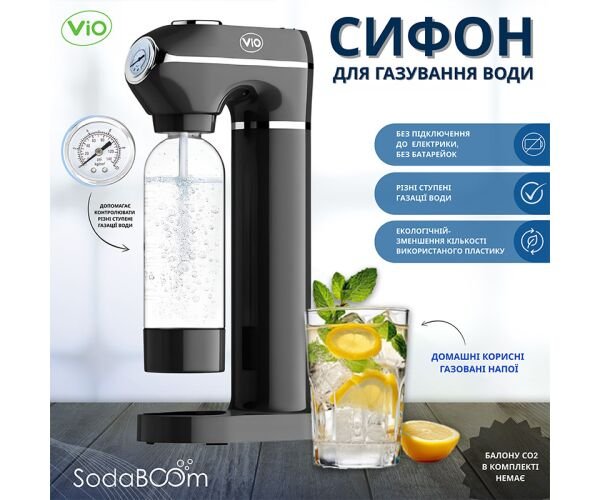 ViO SodaBoom SD-7006 grey — механічний сифон для газування води з манометром. Стильний, безпечний, працює без електрики. У комплекті пляшка 1 л, сумісний із CO₂-балонами.