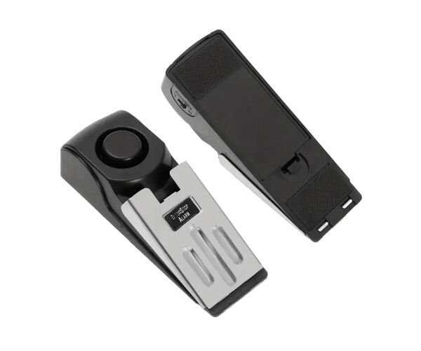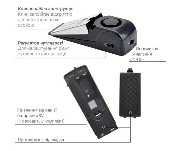 Пристрій працює за принципом клина: встановіть його біля нижньої частини дверей — і у разі натиску на двері клин блокує рух, а вбудована сигналізація активується. Завдяки цьому навіть спроба проникнення стає неможливою, а ви миттєво дізнаєтеся про небажаного гостя.