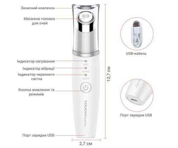 Ергономічний дизайн TOUCHBeauty має елегантну форму, яка легко ковзає по контуру очей. Завдяки компактним розмірам його зручно брати з собою у подорож, офіс чи навіть на прогулянку. Зарядка через USB — це ще один плюс до мобільності та простоти використання.